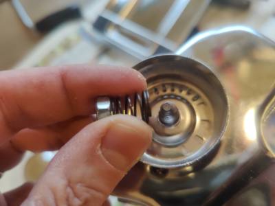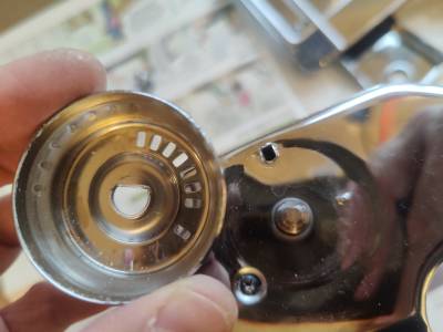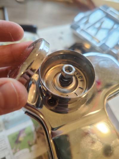 First, remove the lid of the thickness setting dial. The lid is a press fit and a thin, sharp screwdriver can be used to carefully work the lid out of the dial cup. Watch your fingers and take care not to scratch the surface of the lid or the dial cup.
