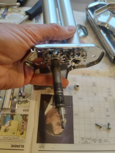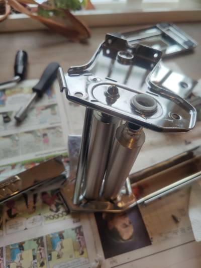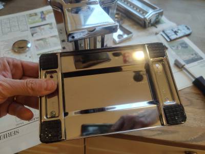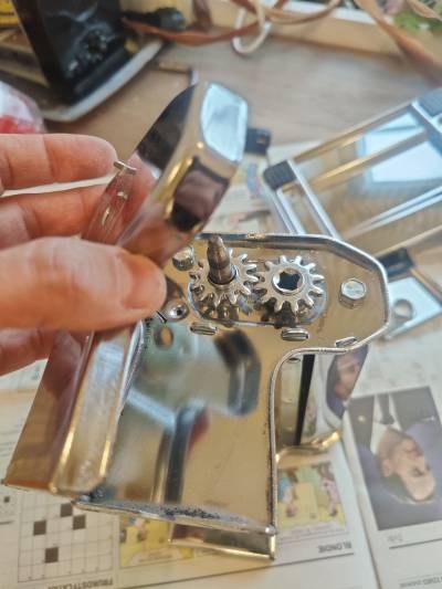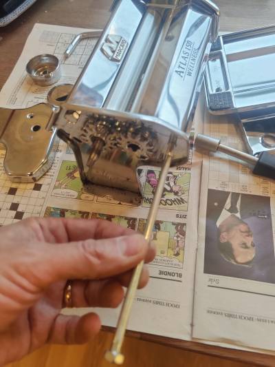 The pasta maker, a Marcato Atlas 150, was giving off such a terrible squeaking when used. Disassembling it, the cause was found to be dried out grease.