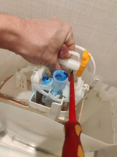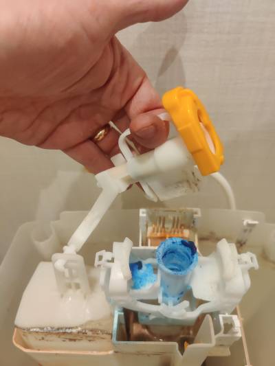 The plunger has its aged and therefore faulty rubber seal mounted in the middle of the plunger. The rubber part at the end is for sealing off the water from the main pipe.